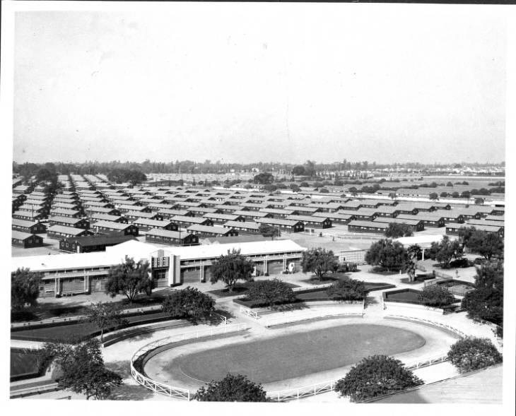 "Photo shows a portion of the completed Santa Anita (California) Assembly Center, situated within the world famous race track at Arcadia, California. This was the largest of all the temporary centers and quartered close to 19,0000 persons at its peak period." (John M. Flaherty Collection of Japanese Internment Records)
