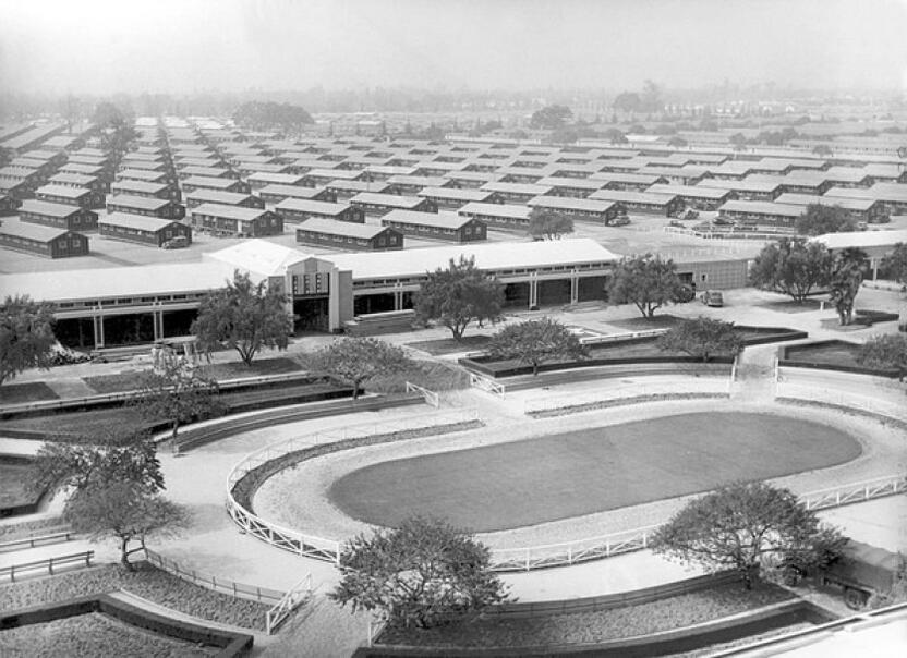 "Photo shows a portion of the completed Santa Anita (California) Assembly Center, situated within the world famous race track at Arcadia, California. This was the largest of all the temporary centers and quartered close to 19,0000 persons at its peak period." (John M. Flaherty Collection of Japanese Internment Records)